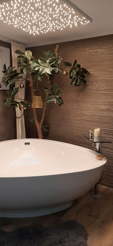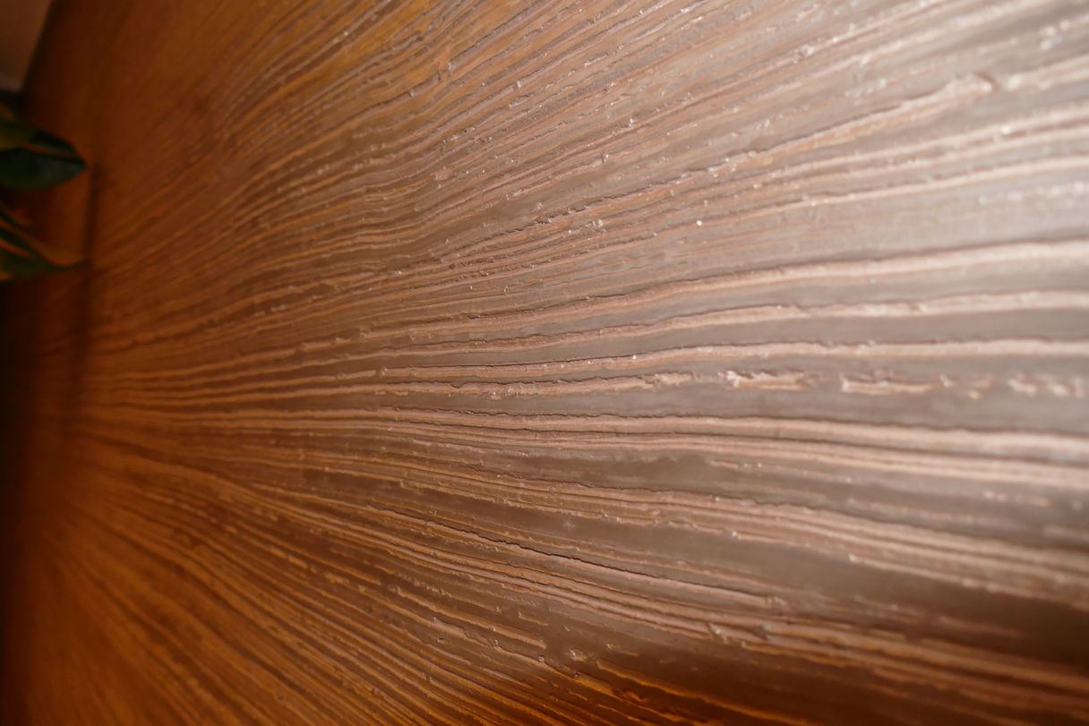 Dieses Badezimmer überzeugt durch seine einzigartige Wandgestaltung in Rindenstruktur-Technik. Die horizontal verlaufenden, fein modellierten Strukturen erzeugen eine natürliche Holzoptik, die Wärme und Tiefe verleiht. Ergänzt wird das Design durch eine individuell angefertigte Schiebetür aus Naturholz mit rustikalen Beschlägen, die den Raum stilvoll abrundet.